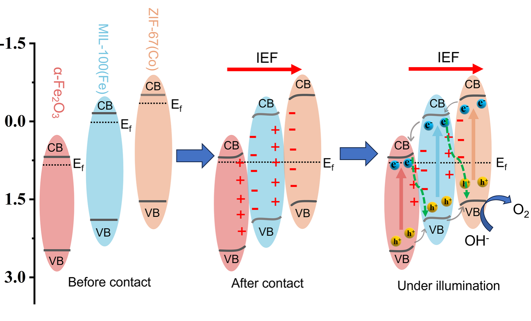 赤铁矿(α-Fe2O3)薄膜因其化学组成可调、能带可控等特点在光电化学分解水(PEC-WS)领域优势凸显,然而表面较低的OER反应速率阻碍了其进一步应用;而MOFs催化剂通过其高比表面积和可调节的纳米结构吸引了广泛关注,将两者的优点结合在PEC-WS领域发挥更大的作用还有待探索。因此公司光电化学转换团队设计了一种新型的MOF-on-MOF (MIL-100-on-ZIF-67)异质结催化剂,并通过原位生长将其负载到α-Fe2O3用于PEC-WS,促使光电化学转换性能提升150%。通过UPS,同步辐射和飞秒瞬态吸收测试,并结合DFT理论计算揭示了复合材料的光生电子与空穴的转移机制。