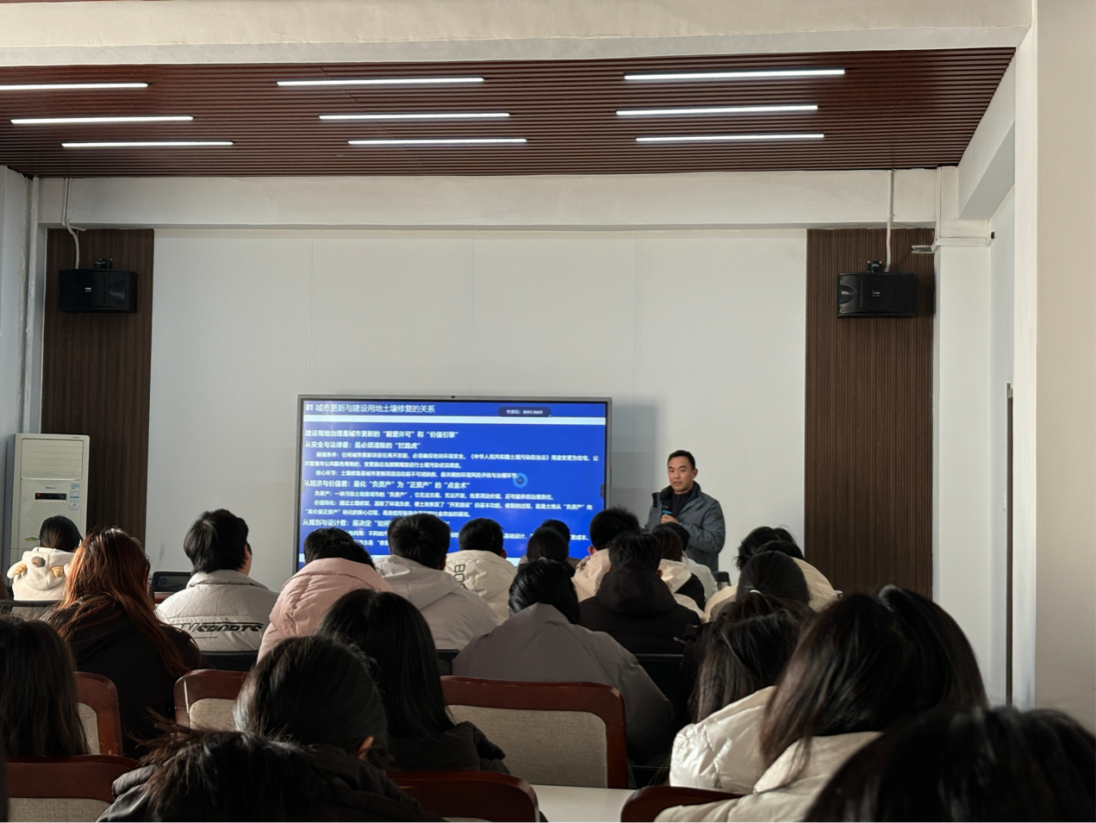 2026年1月7日,中铁一局集团有限公司陈瑞博士与招商局集团有限公司正高级工程师李建亮莅临公司,分别为公司师生做《唤醒沉睡的城市土地》和《“双碳”目标和你我身边这些事》学术报告。